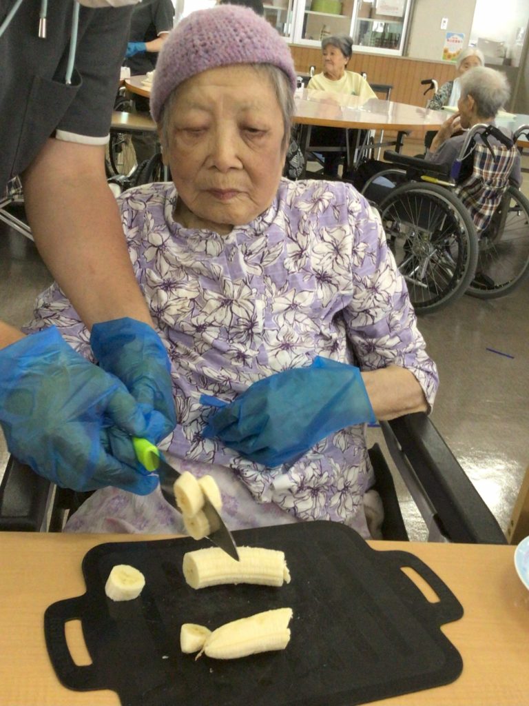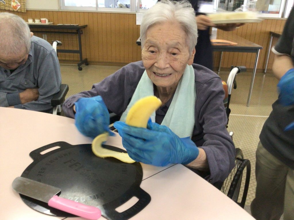 バナナの皮むきからバナナのカット、パンにはさむなどをご利用者さんに実施してもらいました。