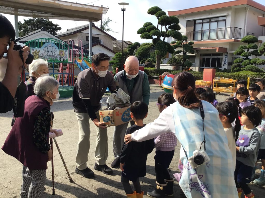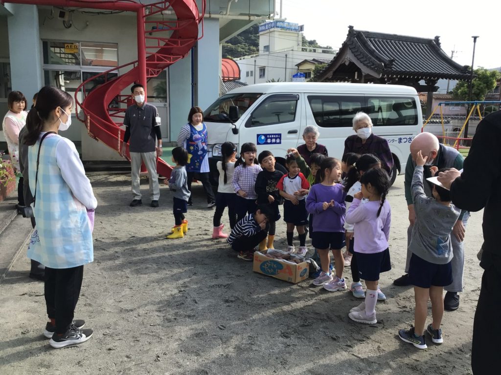 先日収穫した、錦江園中庭産の唐芋を大根占幼稚園にお裾分けしました。入所者さんから園児のみなさんに手渡しすると、たいへん喜んでくださいました。来年は、植え付けも一緒に出来るといいなぁ、と・・・