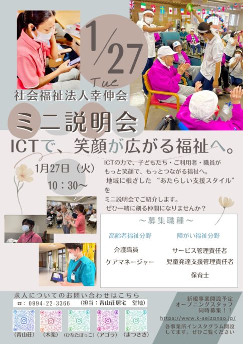 NEWS 法人の説明会を行います~社会福祉法人幸伸会~2026.01.22ハローワーク鹿屋にてミニ説明会を実施 1/27(火)10:30より、幸伸会のミニ説明会をハローワーク鹿屋にて行います。 ご来場お待ちしております!
