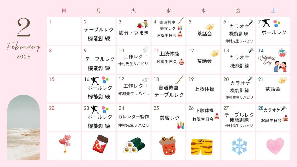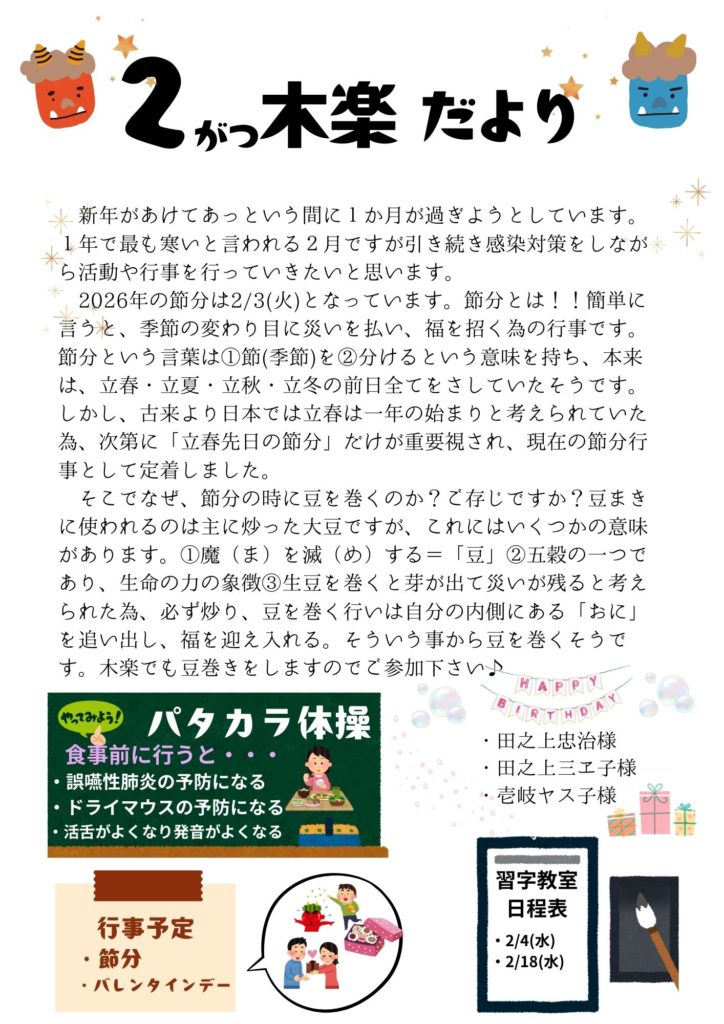 2月行事予定について~デイサービスセンター木楽~